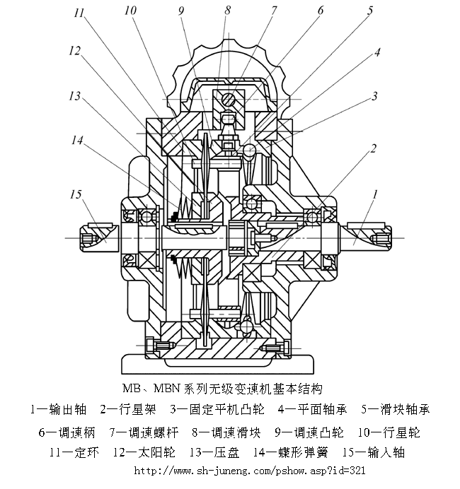 帶錐度的太陽輪12和壓盤13被一組碟形彈簧14壓緊,輸入軸15與太陽輪n鍵聯(lián)接,組成壓緊的輸入裝置。一組帶錐度的行星輪10內(nèi)側(cè)夾在壓緊的太陽輪與壓盤之間,外側(cè)夾在帶錐度的定環(huán)11和調(diào)速凸輪9之間,當(dāng)輸入裝置轉(zhuǎn)動(dòng)時(shí),由于定環(huán)和調(diào)速凸輪固定不動(dòng),行星輪就沿定環(huán)作純滾動(dòng),且繞輸入軸作公轉(zhuǎn),通過行星輪軸及滑塊軸承5而帶動(dòng)行星架2及輸出軸1轉(zhuǎn)l。